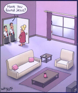 somebody’s open front door. He is saying to the occupant, ‘Have you found Jesus?’ And inside the house, if you look a bit closer,